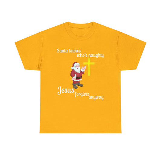 Santa Knows Who’s Naughty, Jesus Forgives Anyway – Heavy Cotton Unisex Christian T-Shirt, Funny Christmas Faith Tee