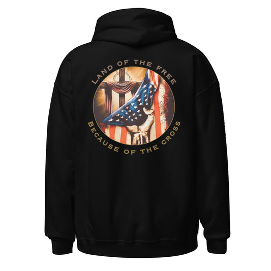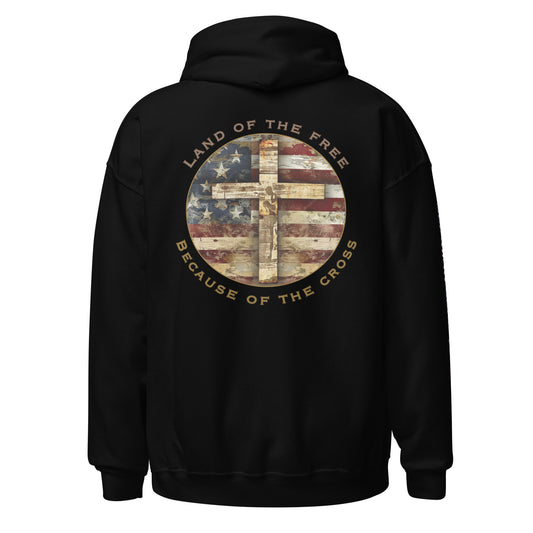 Land of the Free Because of the Cross Hoodie — Rustic Patriotic Christian Design | Unisex Faith-Based Pullover