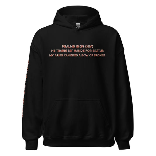 Psalm 18:34 Hoodie – Christian Sword & Templar Knight Design, Unisex Faith-Based Pullover with Slinging Scriptures Sleeve